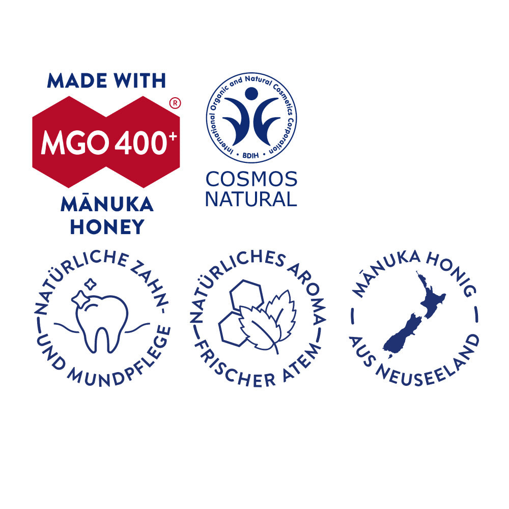 Natürlicher Schutz für Zähne und Zahnfleisch dank unserer neuen Mānuka Health-Zahncreme. Die einzigartige und verbesserte Formel vereint das antibakterielle Power-Trio aus MGO400+ Mānuka-Honig, Propolis und Mānuka-Öl. Hebe deine Zahnpflege und Mundhygiene auf ein neues Level: Mit der Kraft von 1,5 Milliarden Bienen auf jeder Zahnbürste.